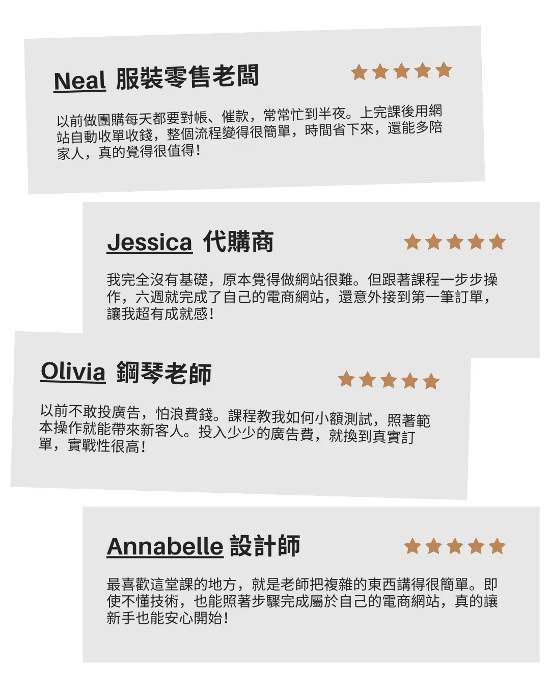 擁有多年電商網站與行銷實戰經驗,專注於 『一人電商創業』 的系統與教學。專長是將複雜的網站技術轉化成簡單步驟,幫助新手創業者快速建立會賺錢的自動販賣機,並透過廣告帶來源源不斷的新客人。